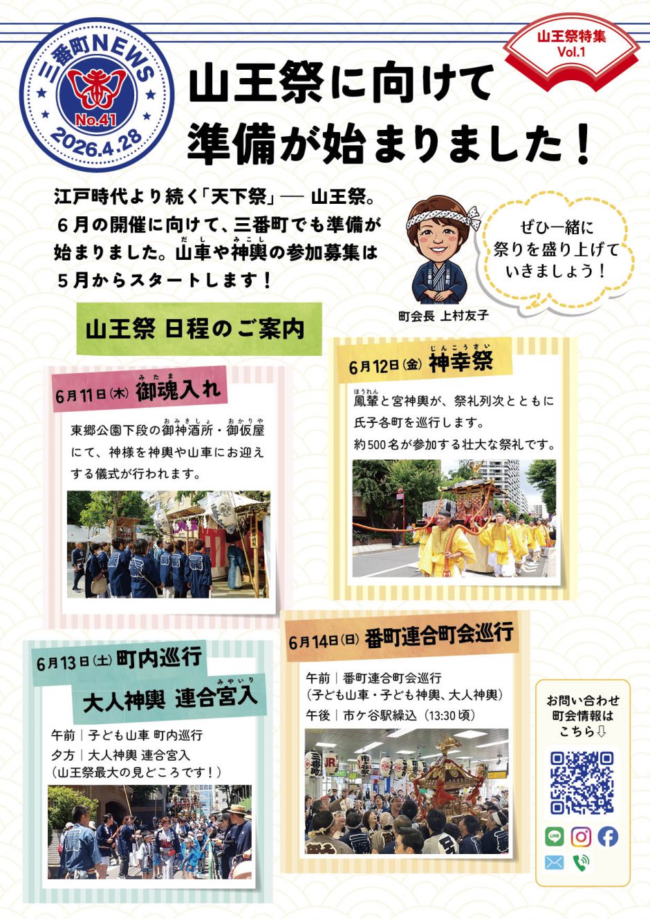 ホーム三番町町会 山王祭 日程のご案内 | 三番町NEWS 2026年4月28日2026年4月29日 山王祭に向けて、三番町でも準備が始まりました。「三番町NEWS」では、山王祭特集第1号として日程をご案内しています。ぜひご覧ください。